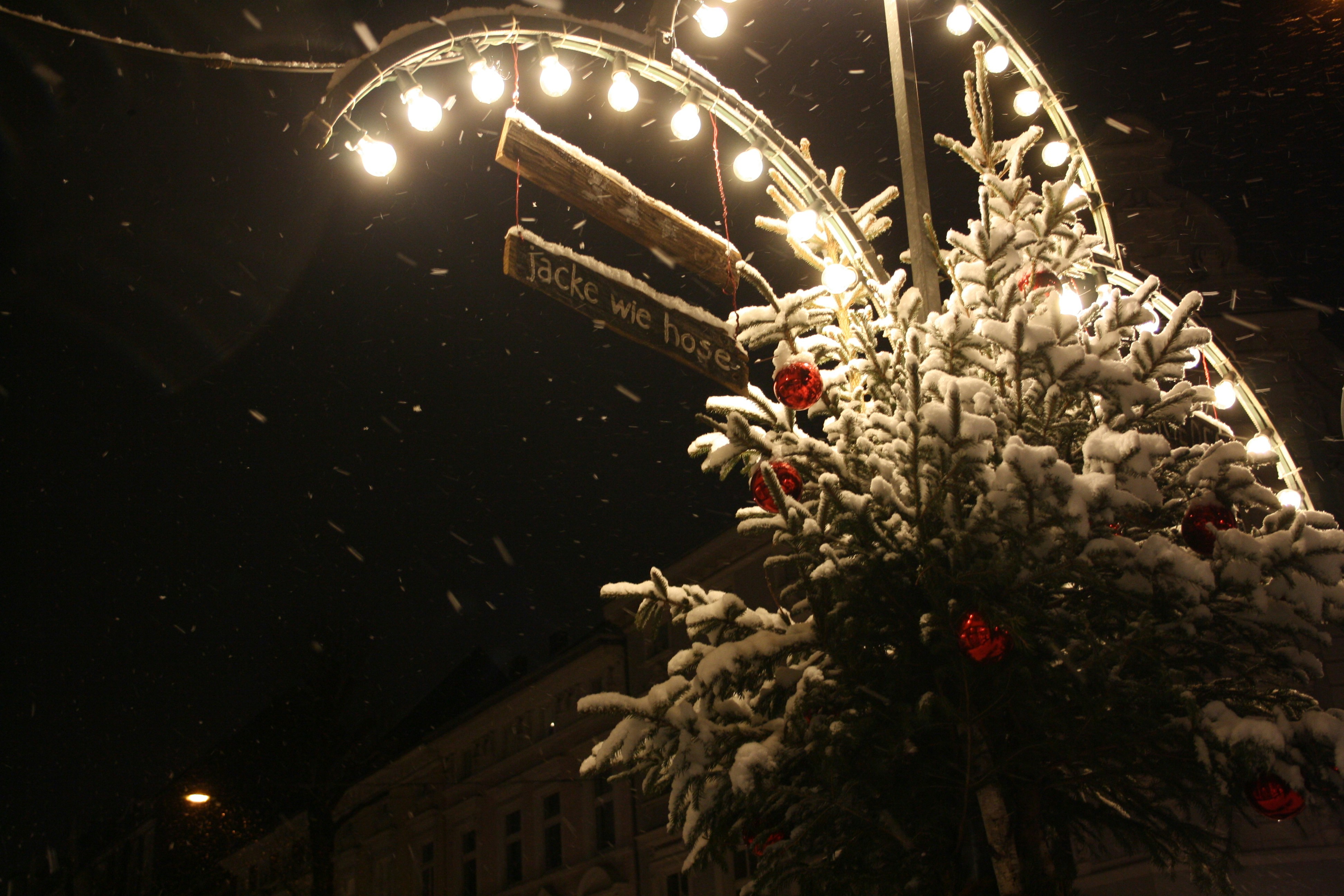 흰 눈이 내리는 독일 크리스마스 마켓 풍경입니다.